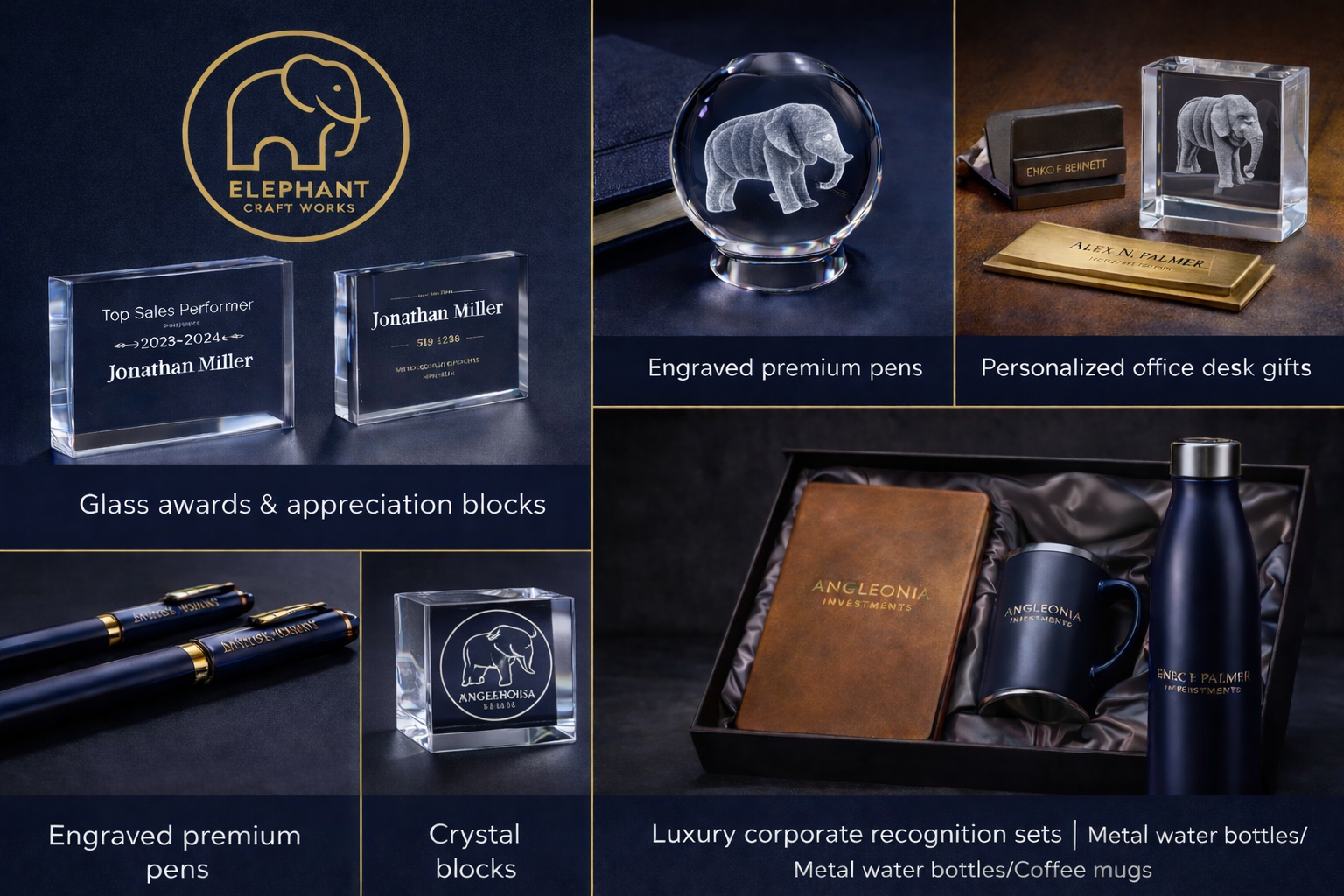 We create premium executive kits including engraved stainless steel metal identity cards, personalized coins, glass, crystal blocks, and custom packaging. Ideal for real estate, law firms, financial institutions, and leadership gifting.